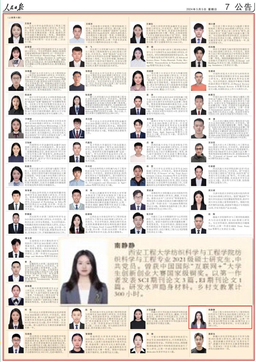 今年五四青年节之际,《人民日报》刊登了《2022—2023学年度研究生国家奖学金获奖学生代表名录》,我校纺织科学与工程学院研究生南静静作为陕西省属高校唯一获奖研究生光荣上榜(全国仅100人),这也是我校学生首次荣登该名录。